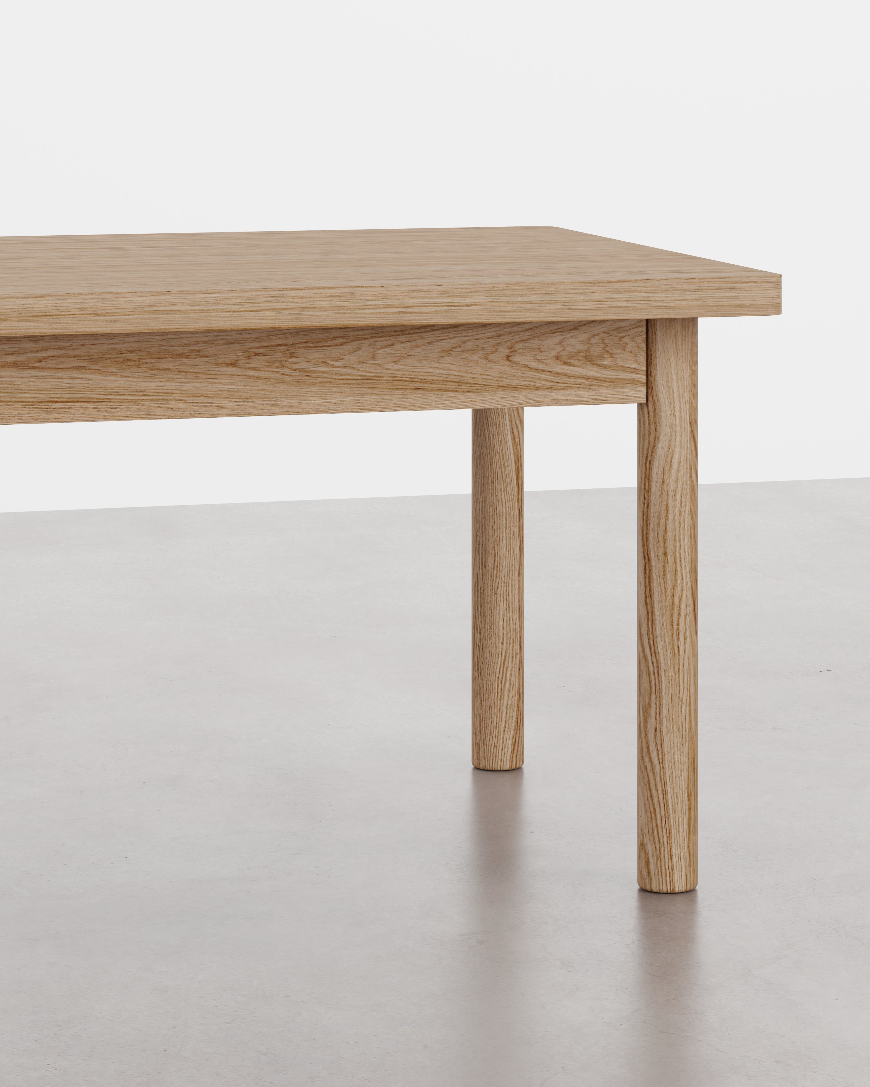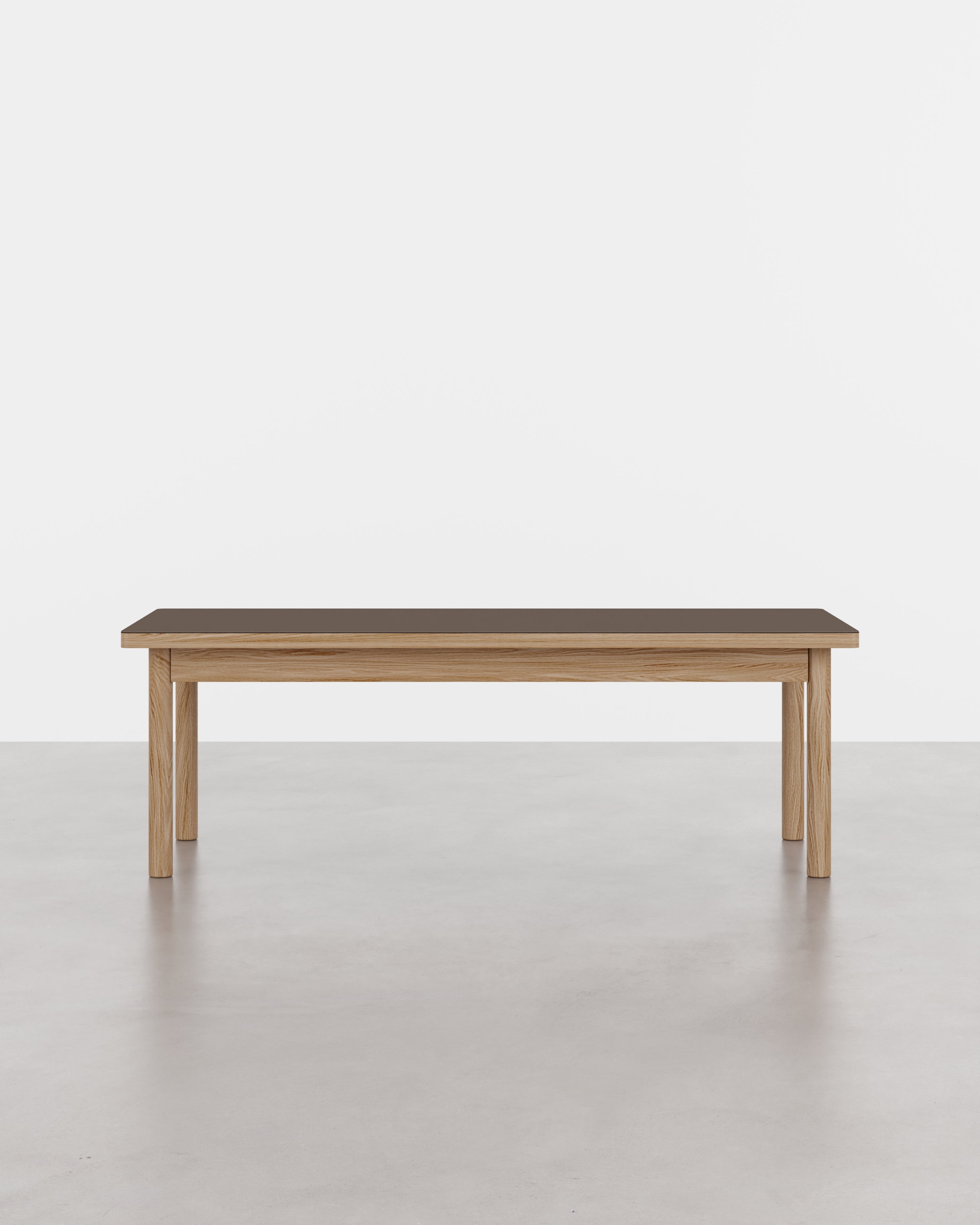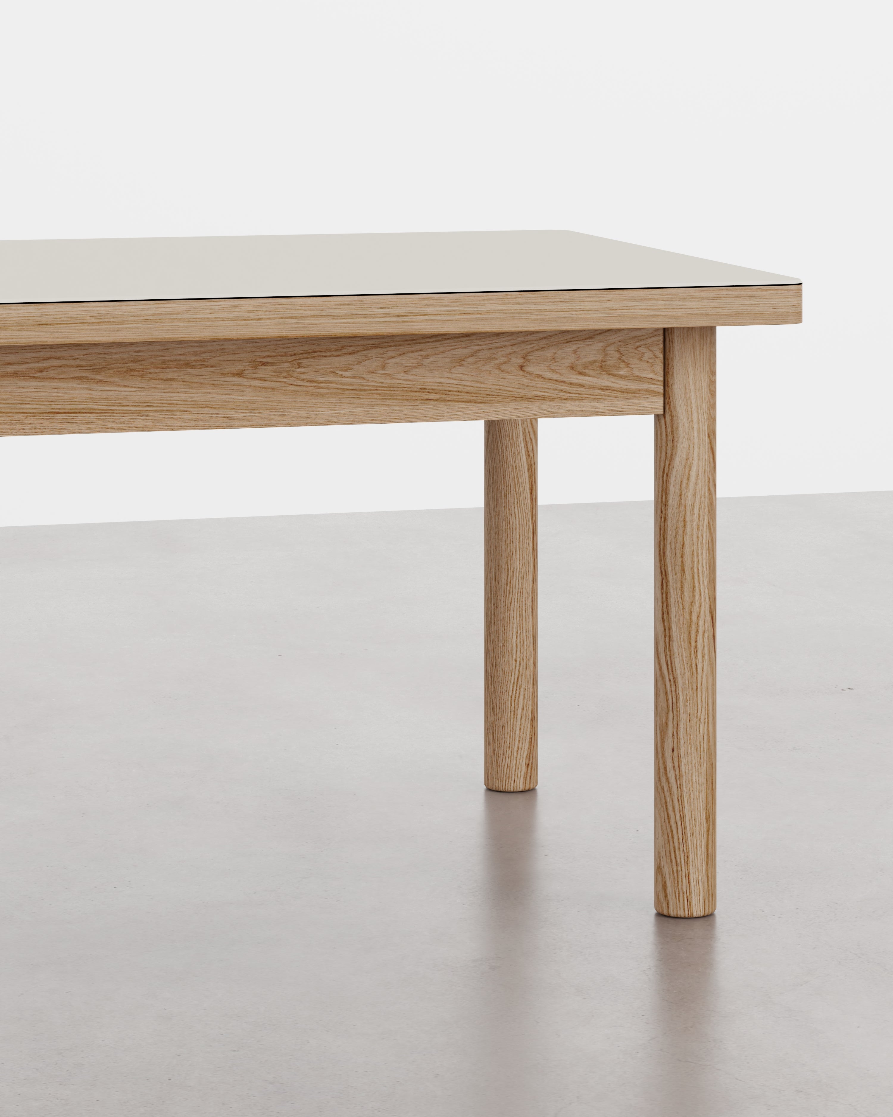Bordet har en bordplade i linoleum eller egetræsfinér og en ramme i massivt egetræ. Kombinationen giver et roligt udtryk og materialer, der fungerer i hverdagen.